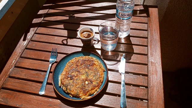 So beginne ich also meinen Sonntag am Dienstag bei schönster Sonne und griechischem Pop von Spotify und einem typisch griechischen Frühstück. Die Griechen lieben jedenfalls lieben Omelette! Dazu natürlich frisches, kühles Wasser und ein griechischer Kaffee – ein Frühstück wie im Urlaub!
