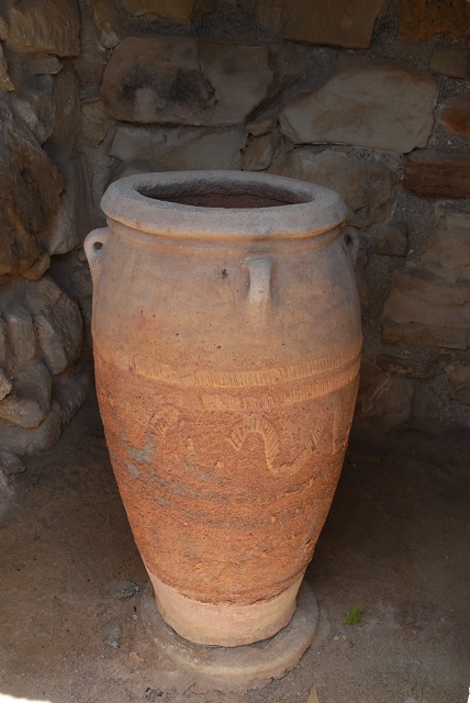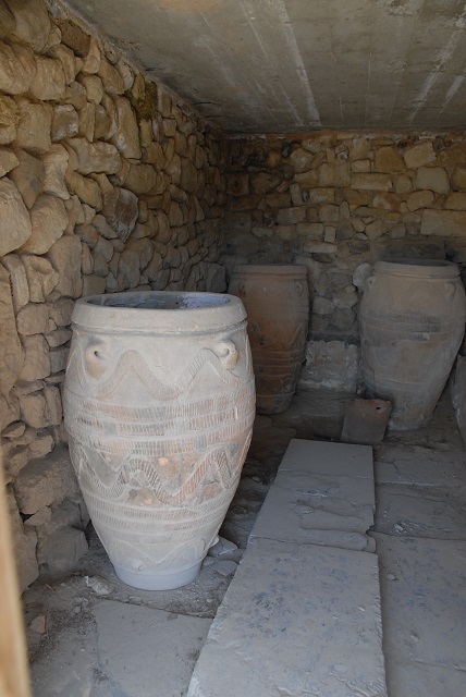 Zurück zu den Fakten. Klassisch für die minoischen Palastanlagen ist der große Zentralhof. Ebenfalls beeindruckend der große Treppenaufgang und der Westhof mit einem Theater. Der Kern des Palastes ist ein Peristylium, um das die Zimmer, Lagerräume und Schreine angeordnet sind. Hier war auch das große Magazin. Die Waren, die in und um Phaistos hergestellt wurden, wurden in großen Tonkrügen, den Pithoi, aufbewahrt, von denen einige noch erhalten sind. Primär wurde in ihnen Olivenöl, Wasser, Honig, Salz und Getreide aufbewahrt. Man kann sehen, das die Mauern früher verputzt waren. Wie es ausgesehen haben kann bleibt der eigenen Vorstellungskraft überlassen.