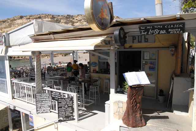 Als John Bowman 1962 hier aufschlug, gab es noch kein Hippies. „Ein weiterer lohnender Ausflug von Festos ist der Besuch des kleinen Badeörtchens Matala, des antiken Metallon, das neben Levin einst Hafen von Gortis war. Von der Festos Hügelkuppe bei einer kleinen Tafel „Matala“ nach links ab. (…) Durch flachgewelltes einsames Land fällt das Strässchen langsam gegen das Meer und führt in einer letzten großen Schleife nach Norden, an Äckerchen vorbei, direkt in die Bucht von Matala, die sich nach Westen zum libyschen Meer hin öffnet.