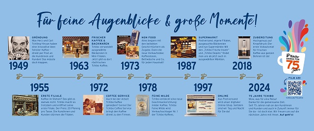 Für alle, die mehr über die einmalige Geschichte von Tchibo wissen wollen: Zum 75. Geburtstag hat Tchibo eigens einen Jubiläumsfilm gedreht, der online und im TV zu sehen sein wird – eine emotionale Reise durch die Zeit von 1949 bis 2024. Auf diese Reise durch die gemeinsame Geschichte nimmt auch das Tchibo Jubiläumsmagazin die Kundinnen und Kunden mit. Und zum Nachhören: In der Jubiläumsfolge des Tchibo Podcasts „Fünf Tassen täglich“ tauchen wir ein in 75 Jahre Tchibo Geschichte, die so eng mit der Bundesrepublik verbunden ist, wie der Kaffee mit der Kaffeetasse.