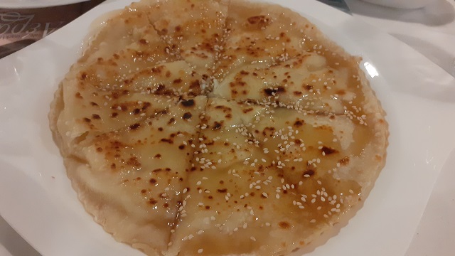 … und Sfakiani, eine Art Pie mit Mizitha-Käse, Thymian und kretischem Honig. Der Kellner hatte uns bei der Bestellung darauf hingewiesen, dass diese Speise sehr süß ist, doch etwas Abwechslung tat uns gerade gut.
