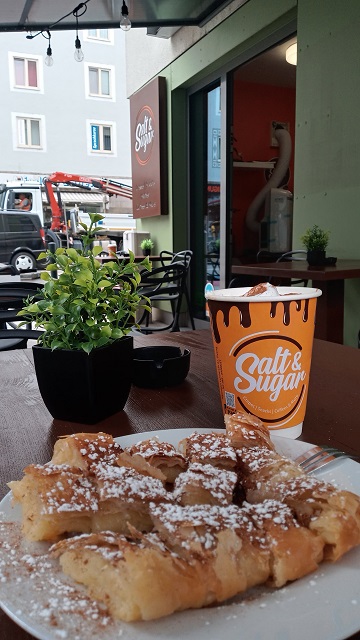 Ich persönlich ziehe zum Frühstück die süße Variante vor. Alternativ hätte es auch anderes Gebäck und süße oder salzige Crêpes gegeben. Als Frühstück ist aber Bougatsa am authentischsten. Dazu ein Cappuccino freddo, die eiskalte Version des beliebten italienischen Kaffeegetränks. Leider ebenso authentisch ist der Pappbecher. Der ist zwar ein hübsches Fotomotiv, aber leider suboptimal für die Umwelt – der einzige Kritikpunkt der mir auffällt.