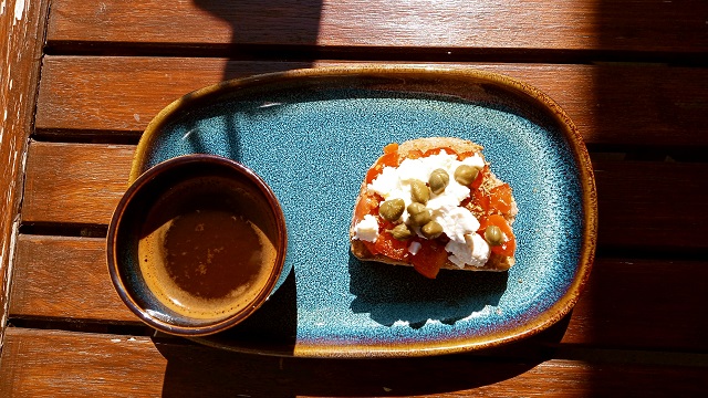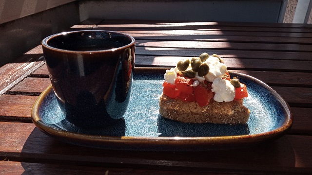 Ein kleiner Happen vor dem Schreiben: Dakos und ein griechischer Kaffee! Ihr erinnert Euch an Dakos? Das Rezept dafür gab es vor kurzem hier im Blog. Es handelt sich um eine Art eingeweichten griechischen Zwieback mit Olivenöl, Tomaten, Oregano, Feta und Kapern. Ein nettes, kleines und gesundes Frühstück und eine willkommene Gelegenheit meine kleinen blauen Kaffeebecher einzuweihen.
