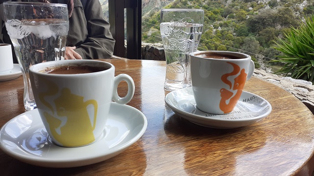 Verweilen wir noch einen Augenblick an der Topolia-Schlucht. Hier stärken wir uns nämlich in der Taverna Romantza mit einem Kaffee mit Aussicht auf die Schlucht. Und trotzdem liegt das eigentliche Ziel noch vor uns. Genauer gesagt 270 Stufen über uns. Doch was da ist, dass erzähle ich Euch morgen!