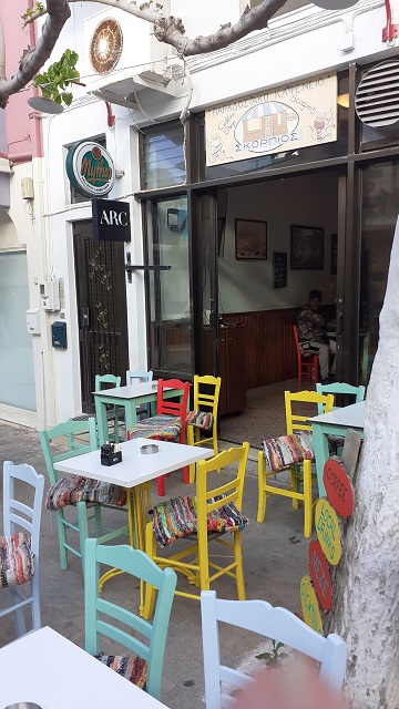 Auf der Hauptstraße werden wir schnell fündig. Die netten, bunten Stühle mit der Korbauflage laden uns geradezu zum Sitzen ein. So kommt es, dass wir dem traditionellen Café Skorpio einen Besuch abstatten. Ich halte mich an griechischen Kaffee, zu dem es kostenlos ein Stück Kuchen gibt. Noch üppigen fallen die Beilagen zu dem von Martin gewählten Getränk aus: Zu einem Bier für ein paar Euro wird ein kleiner Teller gereicht, der Stücke gegrillten Fleischs, Zucchini-Käse-Torte, Feta, Tomaten, ein Gebäckstück, Gurken, Oliven und eine Peperoni präsentiert. Nach drei Bieren wäre man satt, unglaublich!