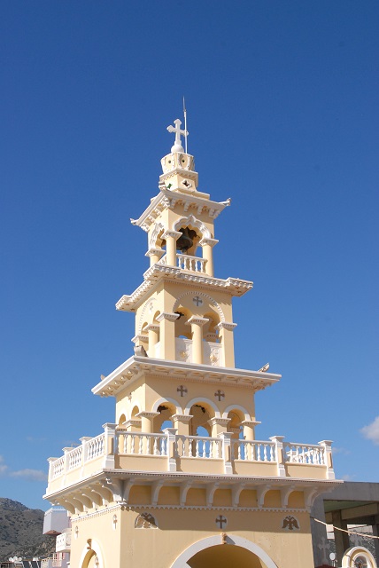 Abends flanieren Einheimische wie Touristen entlang der von Tavernen, Cafés und Bars gesäumten Uferpromenade oder in der ab 18:00 Uhr für den Verkehr gesperrten Hauptstraße, die wichtigste Längsachse des Ortes. Blickfang im Süden ist die in strahlendem gelb getünchte, 1914 erbaute und jüngst erweiterte Dorfkirche Mariä Verkündigung mit dem Campanile, dem freistehenden Glockenturm im Zuckerbäckerstil, vor der Silhouette des Kastells.