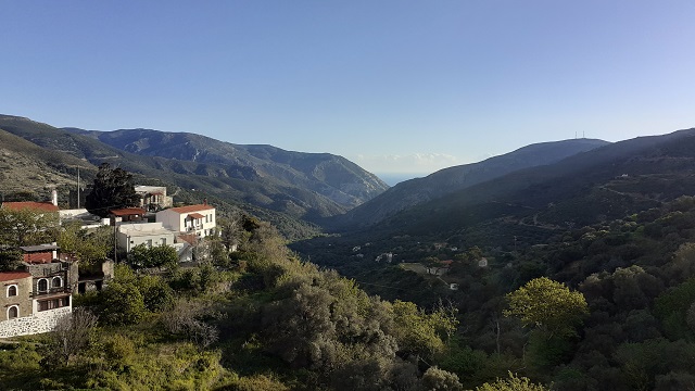 Eine der beiden Tavernen ist das Panorama, das gleichzeitig auch der Dorf-Supermarkt ist. Der Name ist Programm: von hier aus hat man eine wunderbare Aussicht in das Tal von Vathi im Westen. Wie Schwalbennester kleben kleine weiße Häuschen und eine Kapelle am gegenüberliegenden Hang. Von hier schlängelt sich die Straße kurvenreich nach Elafonisi an der Küste. Die Besitzerin von Taverne, Supermarkt und unserer Unterkunft ist Irene. Das bedeutet, dass wir unsere Schlüssel von ihr in Taverne bekommen.