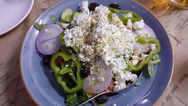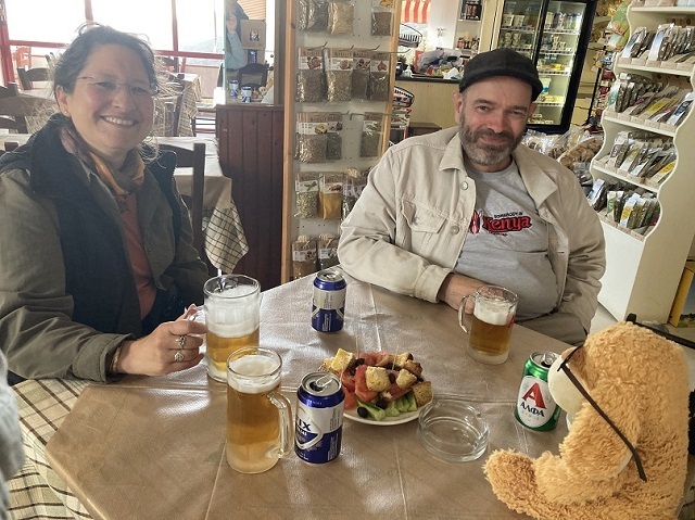 Und nun ist es 22:40Uhr, Irene und ihr kleiner Sohn Theo haben sich schon verabschiedet, nach dem reichhaltigen Essen bekamen wir als Dreingabe natürlich noch warmen Kuchen und Raki, dann den übrigen Raki von den britischen Tischnachbarn, und während die Einheimischen noch lautstark Essen lassen wir den Tag bei Weißwein und Bier Revue passieren, freuen uns auf eine ruhige Nacht und frische, kalte Bergluft im Steinhaus über Kefali.
