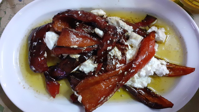 Wir nehmen also das Boureki und – um es kurz zu machen – kretischen Salat, Auberginen-Creme, gegrillte Peperoni mit Feta und Tsigariasto, ein im Ofen geschmortes Lamm und unverzichtbares Gericht der kretischen Küche.