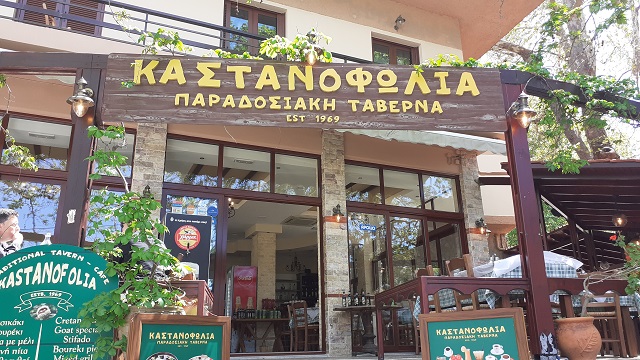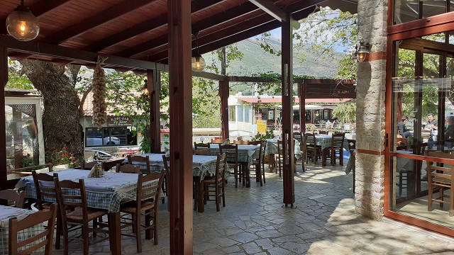 Und schon melden sich weltliche Gelüste, trotz des späten Kuchen-Frühstücks. Fündig werden wir in einer Taverne, die die Kastanie schon im Namen trägt: Kastanofolia. Außerdem gibt es hier ein Briam auf der Karte. Mal sehen ob es diesmal klappt. Und so betreten wir die geräumige Taverne, deren große Fenster viel Licht ins innere lassen – ein freundlicher Raum. Dazu gibt es auch noch eine Art Wintergarten. Hier lassen sich bestimmt laue Sommerabende vortrefflich verbringen.