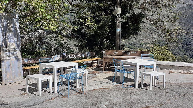 Krystalia Cafe, Ιερος Ναος Παναγιας, Pappadiana, Kreta, Griechenland; Öffnungszeiten: 13:00 – 22:30 Uhr, außerhalb der Saison nur von Freitag bis Sonntag.