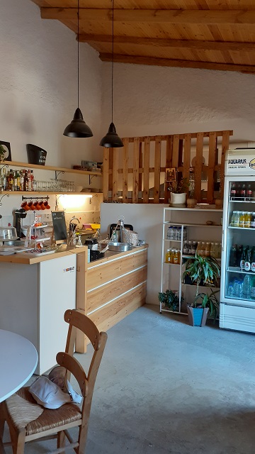 Das Café selbst ist hell aber einfach eingerichtet. Den schönsten Platz gibt es auf der Terrasse davor, doch für größeren Andrang gibt es über die Straße nach noch mehr Bänke, Stühle und Tische. Auf jeden Fall ein gemütlicher Ort zum Verweilen.