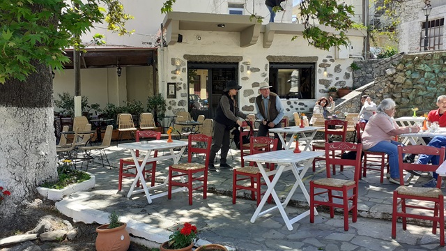 Um ehrlich zu sein: die Tafeln haben wir schlicht übersehen. Wir haben auch nicht während der Geschichte des Dorfes angehalten, sondern wegen des einladenden traditionellen Cafés. Das kleine „Kapetanisa Traditional Cafe“ liegt direkt an der Hauptstraße und verfügt vis-à-vis unter den hochgewachsenen Platanen über einen kleinen Biergarten. Im bescheiden eingerichteten Gastraum sitzen nach alter Sitte die Einheimischen. Natürlich nur ältere Herren. Den Platz an der Sonne überlassen sie den Touristen. Trotzdem quittieren sie eine höflich vorgetragene Begrüßung beim Betreten des Kafenio mit Wohlwollen.