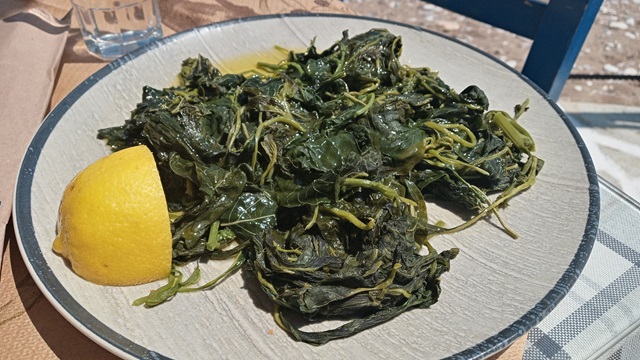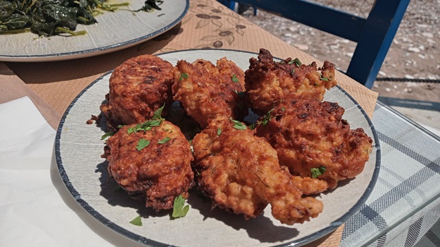 Wir begnügen uns mit einer Portion Chorta, ein griechischer, warmer Wildgemüse-Salat. Dazu gönnen wir uns einen griechischen Bauernsalat. Und schließlich teilen wir uns einen Teller Kolokithokeftedes – Griechische Zucchinipuffer. Ein schöner Lunch am Meer, der uns optimal auf unseren gemeinsamen Urlaub einstimmt.
