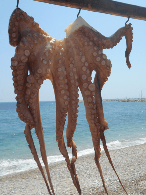 Das Frühstück lassen wir ausfallen, obwohl wir hungrig sind. Das bringt uns auf die Idee in einer der Tavernen direkt am Meer, die heute schon geöffnet hat, gleich mit einem Mittagssnack weiterzumachen. Unsere Wahl fällt auf die Taverne „Nero & Alati“, ein offensichtlich für Fisch bekanntes Restaurant. Das erkennt man auch daran, dass die ersten Oktopoden fangfrisch in der Sonne dörren und darauf warten zum Abendessen gegrillt und dann verspeist zu werden.
