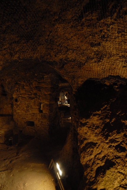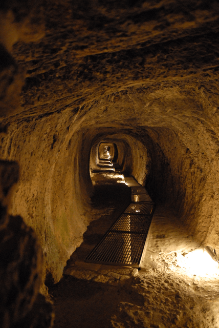 Wir bekommen Helme. Nicht etwa, weil der Tunnel bröckelt, sondern weil wir uns sonst alle Nase lang die Köpfe kaputthauen würden. Es ist niedrig und von klaustrophobischer Enge. An den Wänden kann man noch die Spuren der Meißel sehen. Unter größten Mühen wurde hier der Stein abgebaut, was das Bauwerk nur umso beeindruckender macht. Tatsächlich gibt es zwei Stollen. Aktuell begehbar ist nur der obere Stollen. Sechs Meter darunter liegt ein weiterer Tunnel. Immer wieder gibt es Verbindungsschächte durch die man früher klettern musste, wenn man zum Beispiel für Reparaturen in den unteren Tunnel musste. Wer hier sein Handy oder seine Autoschlüssel verliert, der gibt späteren Generationen von Archäologen Rätsel auf. Ein Möglichkeit etwas zu bergen besteht nicht. Die Führung geht bis zum Durchschlagspunkt, wo die beiden Stollen aufeinandertreffen und dann wieder zurück.