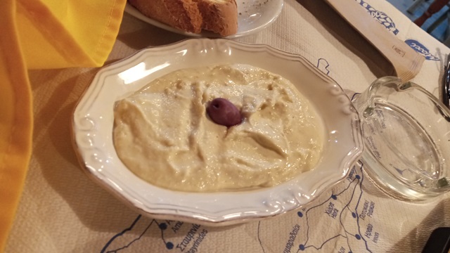 Wir beginnen den Abend neben dem gerösteten Brot, an das wir uns schon gewöhnt haben, mit einem Tzatziki. Dazu gönnen wir uns eine Portion Fava, ein Gericht, dass ich auf Kreta kennen und schätzen gelernt habe. Es handelt sich dabei um ein aromatisches Platterbsenmuss mit etwas Olivenöl. Lecker.