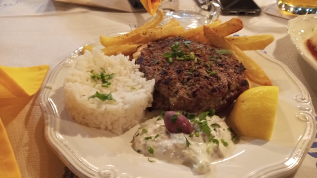 Dann kommen unsere Hauptgerichte: da hätten wir einmal ein leckeres Bifteki, gefüllt mit Feta, mit Kartoffelspalten und Reis. Ein leckerer Klassiker, besonders wenn er frisch vom Grill kommt.