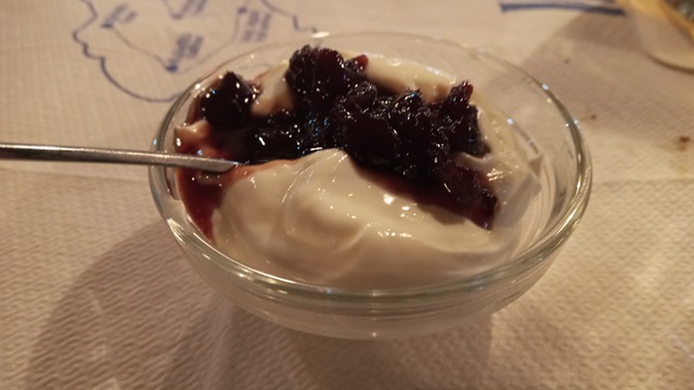 Dann bekommt jeder von uns noch einen kleinen Nachtisch: griechischer Joghurt mit eingelegten Rosinen. Der Trick dabei ist, dass sich getrocknete Rosinen mit Honig vollsaugen. Einfach und lecker.