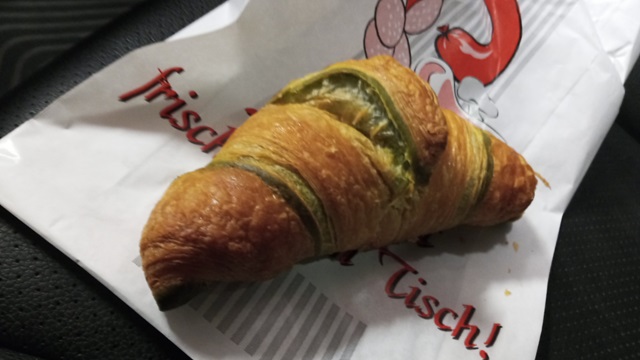 Und Total hat einen ganz passablen Café Crème. Dazu gönne ich mir ein italienisches Cornetto mit Pistazienfüllung. Das gönne ich mir genau so lange, bis jemand auf die Idee kommt es Dubai-Hörnchen zu nennen. Pistazien liegen ja gerade echt im Trend.
