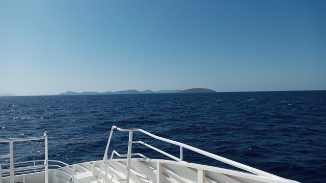 Langsam verschwindet die Insel im Morgendunst. Zeit für ein Frühstück, dass ob der frühen Stunde ausfallen musste. Früh legt die Fähre in Pythagorion ab und macht sich auf ihre Reise durch die Dodekanes. Patmos, Lipsi, Leros, Kalymnos, Kos und Rhodos liegen auf ihrem Weg. Vom „Smutje“ bekomme ich eine griechischen Kaffee, einen Panini-Toast und eine griechische Schokolade, Zartbitter und im blauen Papier. Über die ruhige See kommt das Schiff schnell voran. Das Meer zieht an unserm Fenster vorbei. In kaum zwei Stunden werden wir Patmos, die heilige Insel erreicht haben. Schon taucht sie am Horizont auf und es zeichnet sich die Silhouette des Johannes-Klosters zeichnet sich ab. Doch davon morgen mehr.