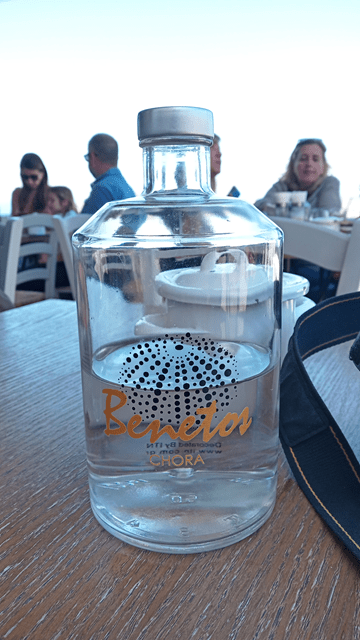 Unsere Wahl fiel auf die Taverne „Benetos Chora“, mit einer der aussichtsreichen Terrassen der ganzen Insel. Kaum hatten wir einen Platz gefunden (nicht ganz einfach in der Hightime), schon hatten wir eine Karaffe Wasser vor uns stehen.