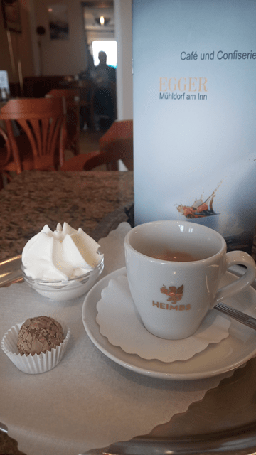 So sitze ich also im Café Egger bei einem zügig servierten und leckeren Espresso und einer noch leckereren Schoko-Praline (alkoholfrei), einer kleinen fachmännisch hergestellten Köstlichkeit – ein Genuss! Das nette Café am Bahnhof wäre durchaus mal einen ausführlicheren Besuch wert. Nun geht es aber weiter nach Burghausen.