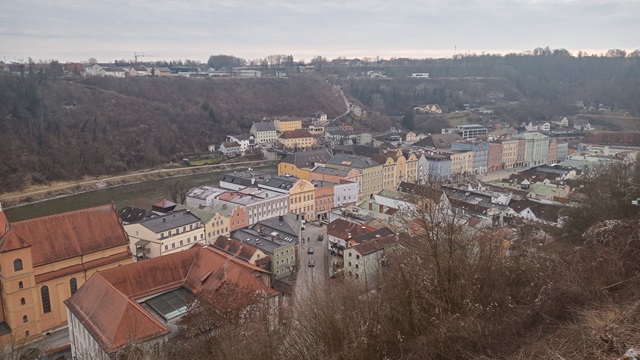 Die weltlängste Burg ist nicht allzu weit vom Bahnhof Burghausen entfernt. Etwa 1,2 km geht es hier durch die Neustadt. Hier hat man in die Breite gebaut, was sich in einer geräumigen Hauptstraße, der Marktler Straße, ausdrückt. Ich folgend erreicht man zügig die Nordseite der weltlängsten Burg. Wie ein schlafender Lindwurm liegt die Burg auf dem Bergrücken, der Schwanz im Norden, der Kopf mit der Hauptburg im Süden. Im Osten begrenzt die Altstadt am Ufer der Salzach – und damit an der Grenze zu Österreich – den Ort, im Westen liegt der Wöhrsee, der Altwasserarm der Salzach.