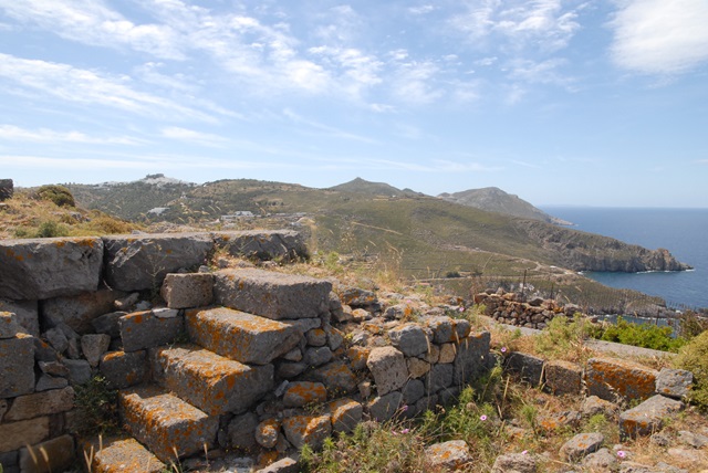 Erst von hier oben erkennt man die wahre Größe der einstigen Anlage. Was mehr Fragen aufwirft, als sie beantwortet. Wer erbaute hier so eine umfangreiche Akropolis? Wie bedeutend war die Insel in der Antike? Leider schweigen sich die antiken Quellen darüber aus. Was bleibt sind gewaltige Steinquader, die hier verstreut liegen, als hätten Riesen mit ihnen gespielt und der schönste Blick über die Insel. Eine karge Insel mit größtenteils recht spärlicher Vegetation, der nur einige Bauern auf einsamen Höfen etwas abtrotzen können. Trotzdem: es gibt sogar etwas Weinanbau hier.
