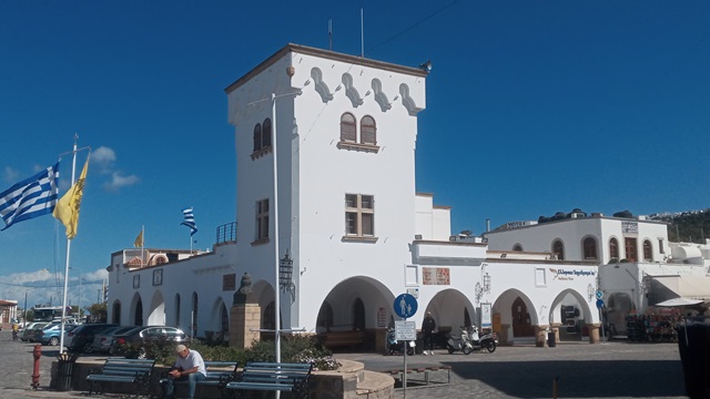 Hier ist es vor allem das Gebäude von Post, Zollamt und der Militärverwaltung, ein markanter Bau im kykladischen Stil, der bis heute von Post und Zoll genutzt wird. Auch das eigentliche Hafengebäude stammt von den Faschisten. Hier wartet man heute auf die Fähren und auch die Küstenwache residiert hier. Als ich vor zwei Jahren nach über 30-jährger Abwesenheit nach Samos zurückkehrte, erkannte ich dort fast nichts wieder. Ganz anders auf Patmos. Schon bei der Landung stachen mir die auffallenden Hafengebäude und die kleine, weiße Kapelle auf dem Felsen ins Auge.