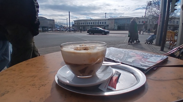 Eine Kaffeespezialität auf der umfangreichen Karte hat mich neugierig gemacht: der Cappuccino Piemonte mit Nuss-Sauce, Sahne und Krokantstreusel. Klingt doch verlockend, oder? Dachte ich auch. Nur ist dieses Produkt wohl nicht vollumfänglich durchdacht. Schmeckt lecker, ohne Frage, nur hat man beim Kaffeetrinken ständig die Krokantkrümel im Mund.