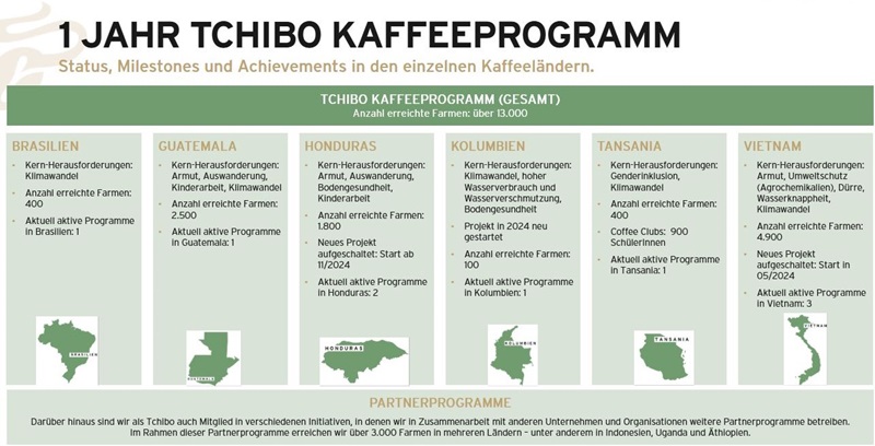 „Mit dem Tchibo Kaffeeprogramm können wir eine positive Entwicklung im Kaffeeanbau erzielen. Sowohl hinsichtlich der Verbesserung niedriger Farm-Einkommen als auch bei der Bekämpfung der Auswirkungen des Klimawandels“, erklärt Pablo von Waldenfels, Direktor Unternehmensverantwortung bei Tchibo. Seit dem Start wurden über 13.000 Farmen in neun Ländern erreicht: in Brasilien, Guatemala, Honduras, Kolumbien, Tansania, Vietnam, Äthiopien, Uganda und Indonesien. Schon jetzt stammen gut 20 Prozent des von Tchibo verwendeten Rohkaffees aus verantwortungsvollem Einkauf. Tendenz: schnell steigend. „Das macht uns zuversichtlich und zeigt, dass wir voll im Plan liegen, um unser Ziel zu erreichen“, freut sich Pablo von Waldenfels.