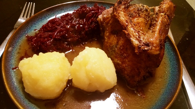 Ente im Ofen ist eine sehr dankbare Angelegenheit, bei der man nicht viel falsch machen kann. Ab in die Raine, Pfeffern, Salzen und mit Kräutern bestreuen, für zwei Stunden in den Ofen packen und regelmäßig drehen, wenden und begießen. Bei dem Blaukraut und den Knödeln habe ich mich mit Fertigprodukten beschieden, ich wollte ja schließlich essen und kein Restaurant eröffnen. Mir ist der Vogel jedenfalls wohl gelungen, nur für ein Abendessen auf dem Balkon war es zu frisch. Ist ja auch erst April.