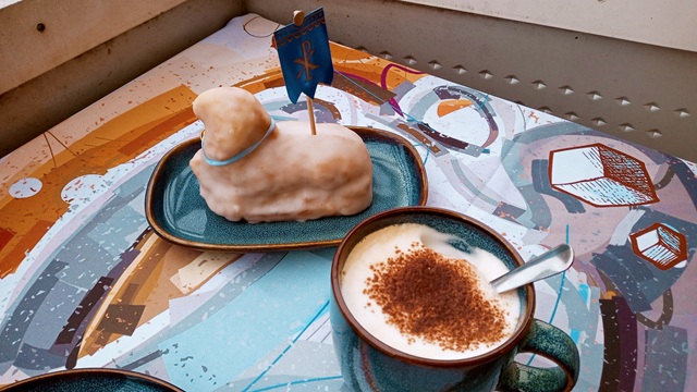 Anders verhielt es sich am Nachmittag. Die laue Luft lud zu einem Nachmittagskaffee auf dem Balkon ein. Nicht fehlen durfte das kleine Oster-Lamm, dass zwar das Frühstück noch unbeschadet überlebt hatte, nun aber zum Einsatz, beziehungsweise zum Verzehr kam. Dass es auch anders laufen kann, davon berichtet meine liebe Blogger-Kollegin Eva von „Zwischen Tiber und Taunus“ in ihrem Beitrag „Oster-Panettone statt Osterlamm: Wie wir (unfreiwillig) italienische Ostern feierten„, der Euch hiermit ans Herz gelegt sei.
