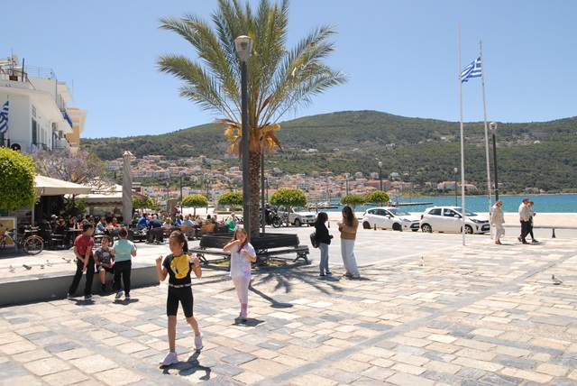 Zu Füßen des Löwen lassen wir uns auf einen Kaffee nieder. Hier erfreuen sich die Samioten ihres Feiertages, Kinder tollen umher, üben Kunststücke mit dem Fahrrad oder spielen Fußball, während die Erwachsenen im Schatten der Palmen und Sonnenschirme sitzen und Kaffee oder alkoholische Getränke konsumieren. Hier – am Pythagoras Vathy Central Square – ist die Stadt so, wie sie gerne überall sein würde, lebendig und Hauptstädtisch. Doch schon wenige Schritte abseits steht man vor geschlossenen Geschäften. In Pythagorion hingegen haben alle Läden und Tavernen geöffnet. So bleibt der Hauptstadtflair für Vathi ein lang gehegter Traum.