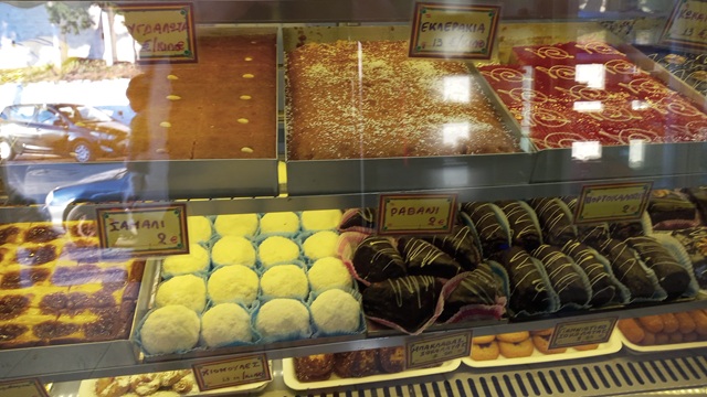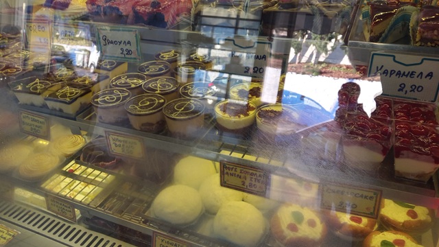 Trotzdem fiel die Wahl schwer. Schon unglaublich, was in einer einfachen Konditorei an der Landstraße so alles angeboten wird. Ich nehme einmal an, dass das Einzugsgebiet um einiges größer sein wird, als nur der Ort Agios Konstantinos hergibt. Gut, dass ich keine Filiale in meiner Nähe habe. Die Versuchung wäre zu groß…