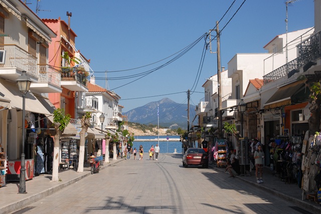 Wie ein Halbmond umschließt die Kleinstadt den Hafen. Kleine Plätze mit schattigen Bänken laden zum Verweilen ein, bunte Blumen und Büsche sprießen an allen Ecken und Enden. Der große Supermarkt heißt Hera. Vom Heraion hat sie es ja nicht weit! Überhaupt scheinen hier viele griechische Gottheiten und Helden einen neuen Job gefunden. Zeus betreibt eine Taverne, wie auch die Hesperiden, Poseidon besitzt einen Autoverleih und Agamemnon vermietet Zimmer, um nur einige zu nennen. Neben dem Hafen ist die Straße, die von der Hauptstraße zum Hafen führt, das eigentliche Zentrum des Ortes.