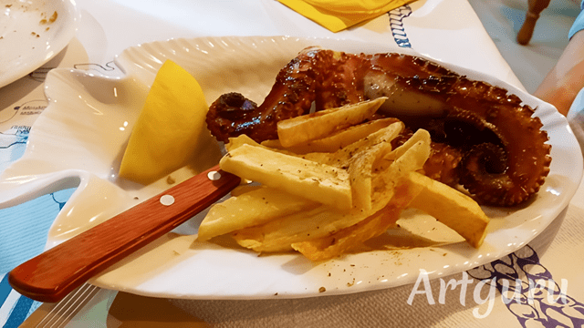 Den verbringen wir natürlich wieder in unserer Stamm-Taverne in Ireon. Nach unserem reichhaltigen Mittagessen reichen uns heute Abend eine Vorspeise und ein Hauptgericht. So gönnen wir uns gegrillten Oktopus und eine kleine Grillplatte mit Souvlaki und anderem.
