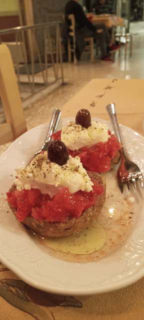 Das „I Kriti“ liegt in einer Passage unweit vom Omonia-Platz. Eine Erinnerung an meine Kreta-Reise. Weshalb ich auch mit einem typisch kretischen Gericht starte: Dakos, Tomaten auf Zwieback. Gefolgt von Sfakiano, einer kretischen Bratwurst. Eigentlich nur zwei Vorspeisen, aber die reichen mir heute nach der langen Reise. Als ich mich auf den Rückweg zum Hotel mache, sind die Straßen schon menschenleer. Wie gesagt, unsicher fühlte ich mich zu keinem Zeitpunkt.