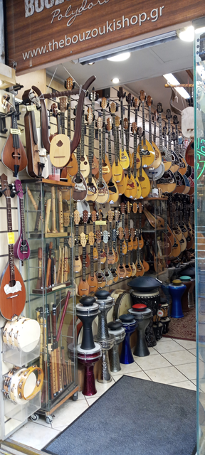 Nur wenige Schritte unterhalb des Lukumades befinden sich die Ladenzeilen von Monastiraki. Hier gibt es nicht nur den größten dauerhaften Flohmarkt Athens, sondern – neben Souvenir-Shops und Tavernen – auch einige Spezialgeschäfte, wie den Bouzouki Shop Polydorou in der Pandrossou Straße. Gegründet wurde dieses Geschäft für traditionelle und moderne Musikinstrumente bereits im Jahr 1976. Was zuerst nur für lokale Musiker gedacht war, genießt inzwischen Weltruhm. Kein Wunder, werden in diesem Familienbetrieb doch seit fast 50 Jahren Bouzukis, Tzourades, Baglamades und Lauten von Hand gefertigt.