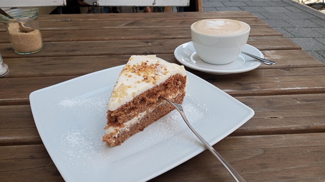 Ich warte nicht lange, bis Marita mir meinen Cappuccino und mein Stück Kuchen bringt. Bis dahin genieße ich die laue Luft an meinem schattigen Plätzchen. Hier ist Neuhausen ein lebendiges Viertel mit vielen kleinen Geschäften und Gastronomie. Der Cappuccino ist wie erwartet kräftig, der Carrot-Cheesecake frisch und lecker. Schade, dass ich schon bald wieder weiter muss, denn hier kann man es echt gut aushalten.