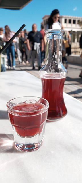 In Monastikari, dem Stadtteil Athens mit den meisten Tavernen, habe ich bei meinem letzten Besuch am Nebentisch eine kleine Karaffe mit einem roten Getränk erspechtet – und natürlich gleich probieren müssen. Wenn Ihr den Rakomelo probiert, müsst Ihr Euch bitte die die Stoa des Attalos und die Akropolis im Hintergrund einfach dazu denken.