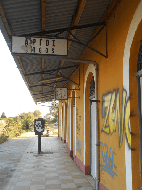 Was übrig geblieben ist sind die maroden Gleise, die man nur im Schritttempo mit dem Wagen gefahrlos überqueren kann und zahlreiche halbverfallene Bahnhofsgebäude. Es ist schon erschreckend wie achtlos man mit seiner Infrastruktur umgehen kann. Nach 53,4 Streckenkilometer ab Korinth liegt der verlassene Bahnhof der Stadt Argos. Ich weiß nicht an welchem Tag er außer Dienst gestellt wurde, aber es war 08:30 Uhr als man der Bahnhofsuhr den Strom abstellte.