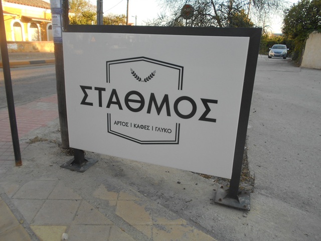 Nur wenige Schritte nach der Station – Σταθμός, also Stathmos auf Griechisch – liegt das gleichnamige Café in einem Neubau. Die ursprüngliche Bahnhofs-Taverne lag gegenüber und ist jetzt eine Ruine. Offenbar hat seit der Stilllegung der Bahnstrecke dieser Ort seine Bedeutung eingebüßt. Doch der Betrieb im Café scheint zu florieren. Ein freundlicher Barista bedient hier eine beeindruckende, moderne Espressomaschine. In der Auslage warten die übriggebliebenen Back- und Süßwaren auf Kundschaft.