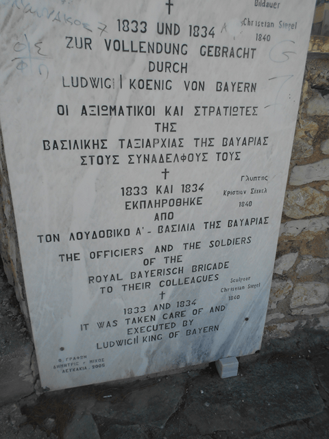 Gestiftet hat dieses Mahnmal König Ludwig der Erste von Bayern im Jahr 1840. Vor Athen war Nafplion die Hauptstadt Griechenlands. 1832 wurde dort der bayerische Prinz Otto zum griechischen König ernannt, der als eine seiner ersten Amtshandlungen kurze Zeit später den Regierungssitz nach Athen verlegte. Etwa auch zu dieser Zeit entstand in Nafplion ein Denkmal mit dem Namen „Bayerischer Löwe“.