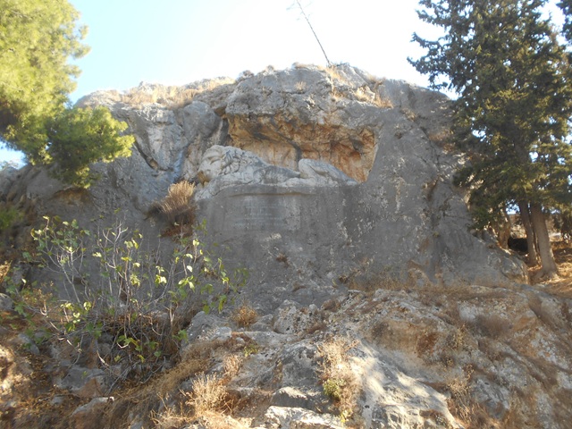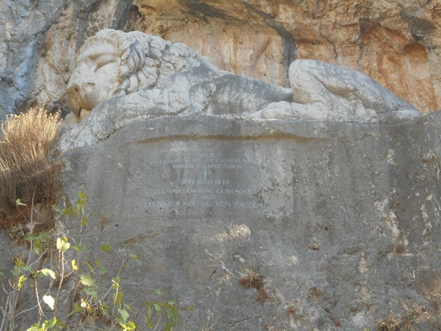 Nein, ich meine mich nicht selbst. Ich meine den bayerischen Löwen von Nafplio. Den gibt es tatsächlich unweit der Altstadt, beziehungsweise der Straße nach Argos. Dort in den Fels gehauen befindet sich ein liegender Löwe. Manche behaupten es sei ein sterbender Löwe. Mit dem Tot hat die Skulptur tatsächlich etwas zu tun. Allerdings nicht mir dem Tot eines Löwen, sondern dem von zahlreichen bayerischen Soldaten, die einer Typhus-Epidemie zum Opfer fielen.
