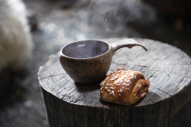 Und Gelegenheiten Kaffee zu trinken gibt es viele. Und da wären wir wieder bei den Bezeichnungen. „Läksiäiskahvi“ nennt sich der Abschieds-Kaffee und „Mitalikahvi“ ist der Kaffee, den man trinkt, wenn jemand beim Sport eine Medaille gewonnen hat. Es gibt auch den Reisekaffee „Matkakahvi“ und den Wahlkaffee. Das ist der Kaffee, den man sich holt, nachdem man in der Wahlkabine war. Der heißt dann „Vaalikahvi“. Und da die Finnen gern überall ihren Kaffee trinken, ist es nicht verwunderlich, dass sie ihn in der freien Natur beim Camping oder Spazierengehen genießen. Das Outdoor-Kaffeetrinken nennt sich dann „Kuksa“ und dafür gibt es natürlich eigene Kuksa-Tassen. Die sind aus Holz. Man kann sie kaufen, aber die meisten Finnen schnitzen sie sich lieber selbst.