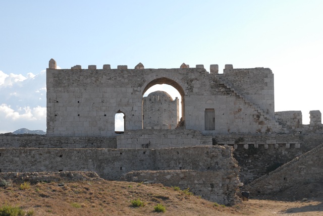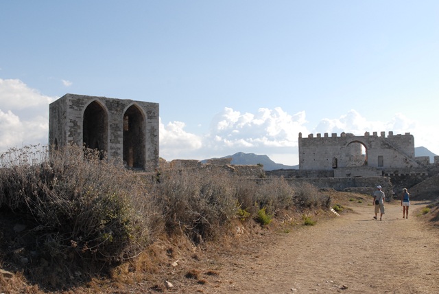 Außerdem sieht man die Ruinen einer Kirchenruine mit dem Stumpf eines Minaretts – sie wurde wohl als Moschee genutzt – gefolgt von einer griechisch-orthodoxe Kirche, der byzantinische Kirche Agios Vasilios und den Ruinen des Klosters De viridario Beatae Mariae. Diese Ruinen verteilen sich auf die etwas mehr als 93 Hektar, über die sich die Burganlage erstreckt. Begrenzt wird der Platz über die sechs bis elf Meter hohe Mauer mit fünf mächtigen Wachtürmen. Im Süden der Festung erheben sich zwei große Kirchenfenster der Kirche der Verklärung des Erlösers und rechts daneben das restaurierte „Tor zum Meer“, dass einen genaueren Blick verdient.