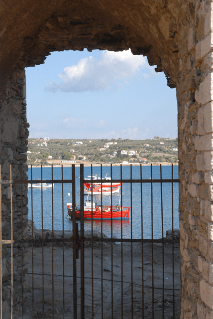 Jetzt muss ich mich aber beeilen, denn um 15:30 Uhr schließt die Festung während des Winterhalbjahres bereits so früh. So viel Geschichte macht hungrig und deshalb kehre ich auch gleich in der ersten Taverne auf dem großen Platz vor der Burg ein, in die Taverne Thalassa. Methoni ist heute ein traditionelles Dorf mit vielen weißen Häusern mit roten Dächern und mehreren geraden Straßen, von denen eine die Einkaufsstraße ist. Und deshalb gibt es auch eine Platia und somit unweigerlich einige Restaurants.
