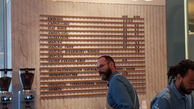 Die Schlange war lang, ging einmal durch den Raum und zurück zur Tür, an der ein Türsteher den Eingang regelte. Doch die Baristi arbeiteten die Bestellungen zügig ab, so dass die Wartezeit wie im Flug verging. Das Glücksrad habe ich mir allerdings gespart, denn zweimal Anstehen wäre dann doch des Guten zu viel gewesen. Ein Espresso kommt auf 2,90 Euro, ein Cappuccino auf 4,20 Euro – also Münchner Preise. Leider gab es den Kaffee nur im Einweg-Becher. Ich hoffe, dass es nach dem Eröffnungs-Andrang auch die Möglichkeit gibt seinen Kaffee im Porzellan zu genießen. Ich werde das überprüfen.